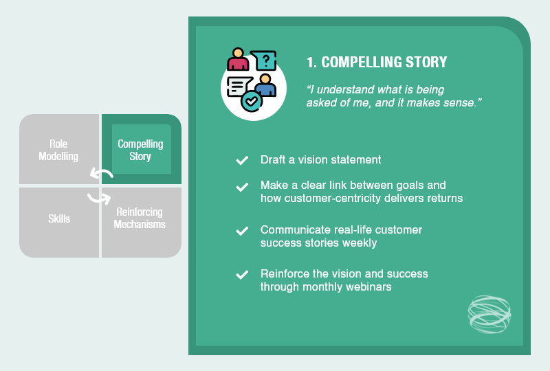 The story needs to be based on a vision that the company can rally around – which is inspirational, simple, clear, and supported by a business plan. It needs to demonstrate believable impacts on the customer experience, which link to measurable economic outcomes. In other words, “if we behave in this way, we create value for our customers and value for us.”
